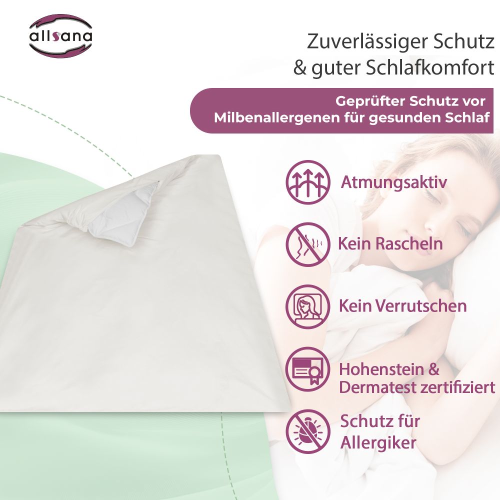 Sie entscheiden sich mit dem allsana-sensitive care Milbenschutzbezug für ein qualitativ hochwertiges Produkt.Prüfen Sie vor dem Beziehen des Bettes , ob die auf der Packung angegebenen Größen mit Ihren Bettgrößen übereinstimmen. Da es sich bei unseren Allergikerbezügen um Hygieneprodukte handelt, die Weitestgehend staub- und milbenfrei verpackt sind, sind Bezüge, die bereits aus der Umverpackung genommen wurden, von der Rückgabe ausgeschlossen.