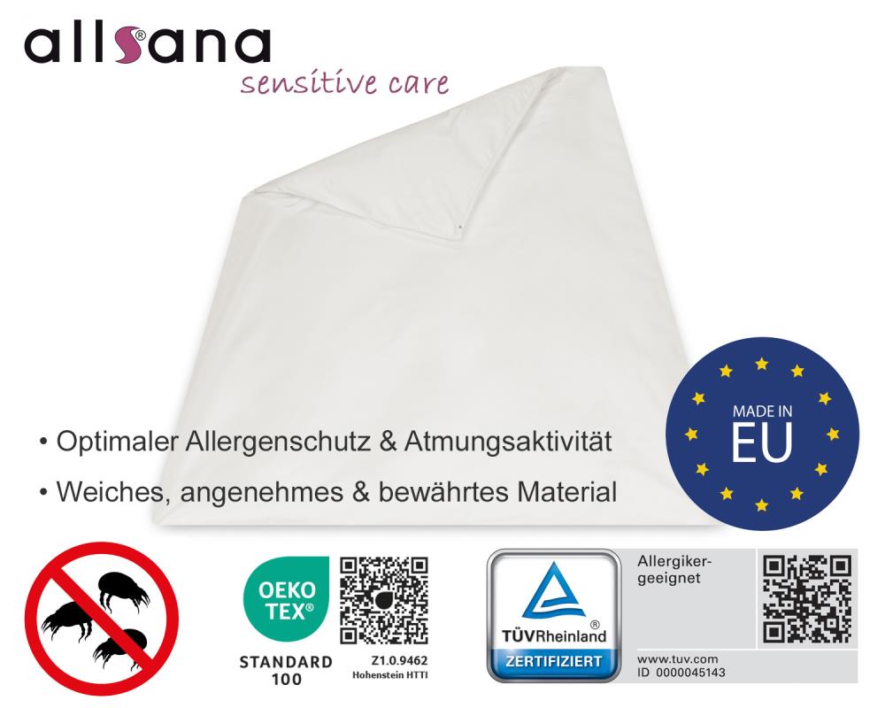 Das Material und auch Nähte und Reißverschlüsse der allsana sensitive care Encasings wurden vom unabhängigen Hohenstein Institut auf Milbenallergen- Dichtigkeit geprüft und zertifiziert.