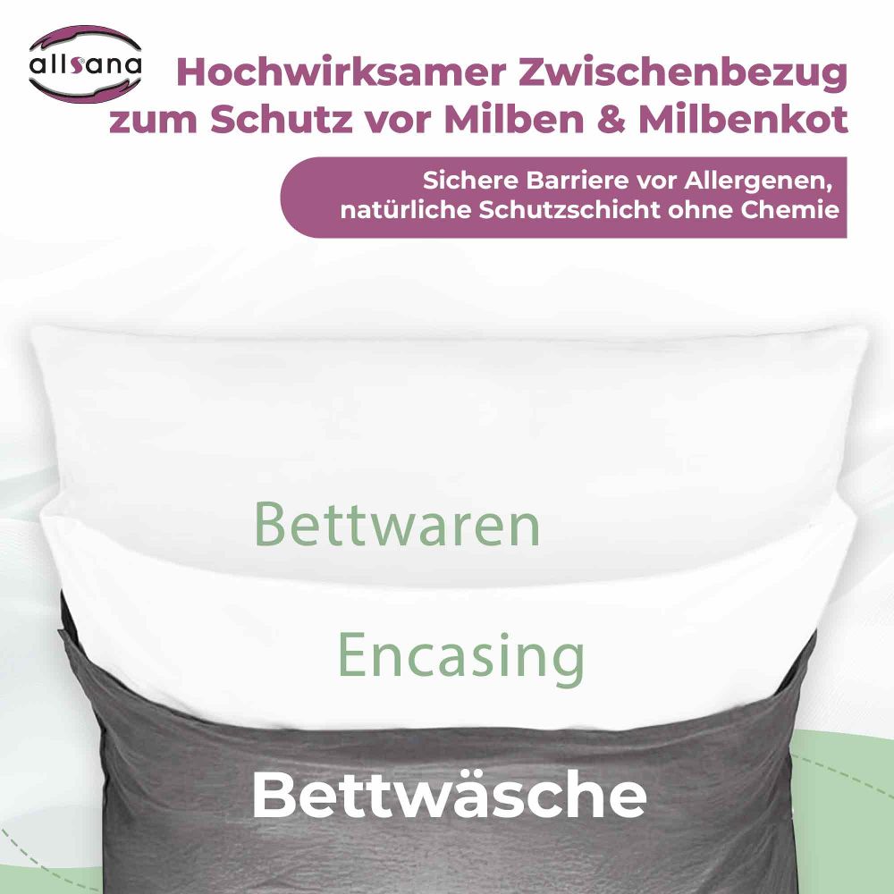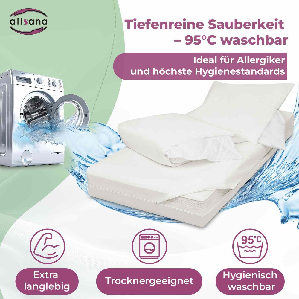 Waschanleitung: Allsana sensitive care Encasings können bei bis zu 95°C gewaschen werden und sind bei niedriger Temperatur trocknergeeignet. Wie alle Encasing müssen die allsana sensitive care Milbenschutzbezüge nur 2-3 mal im Jahr gewaschen werden. Über die Encasings wird die normale Bettwäsche gezogen und diese wird im gewohnten Rhythmus gewaschen.