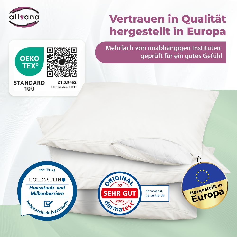 Das Material und auch Nähte und Reißverschlüsse der allsana sensitive care Encasings wurden vom unabhängigen Hohenstein Institut auf Milbenallergen- Dichtigkeit geprüft und zertifiziert.