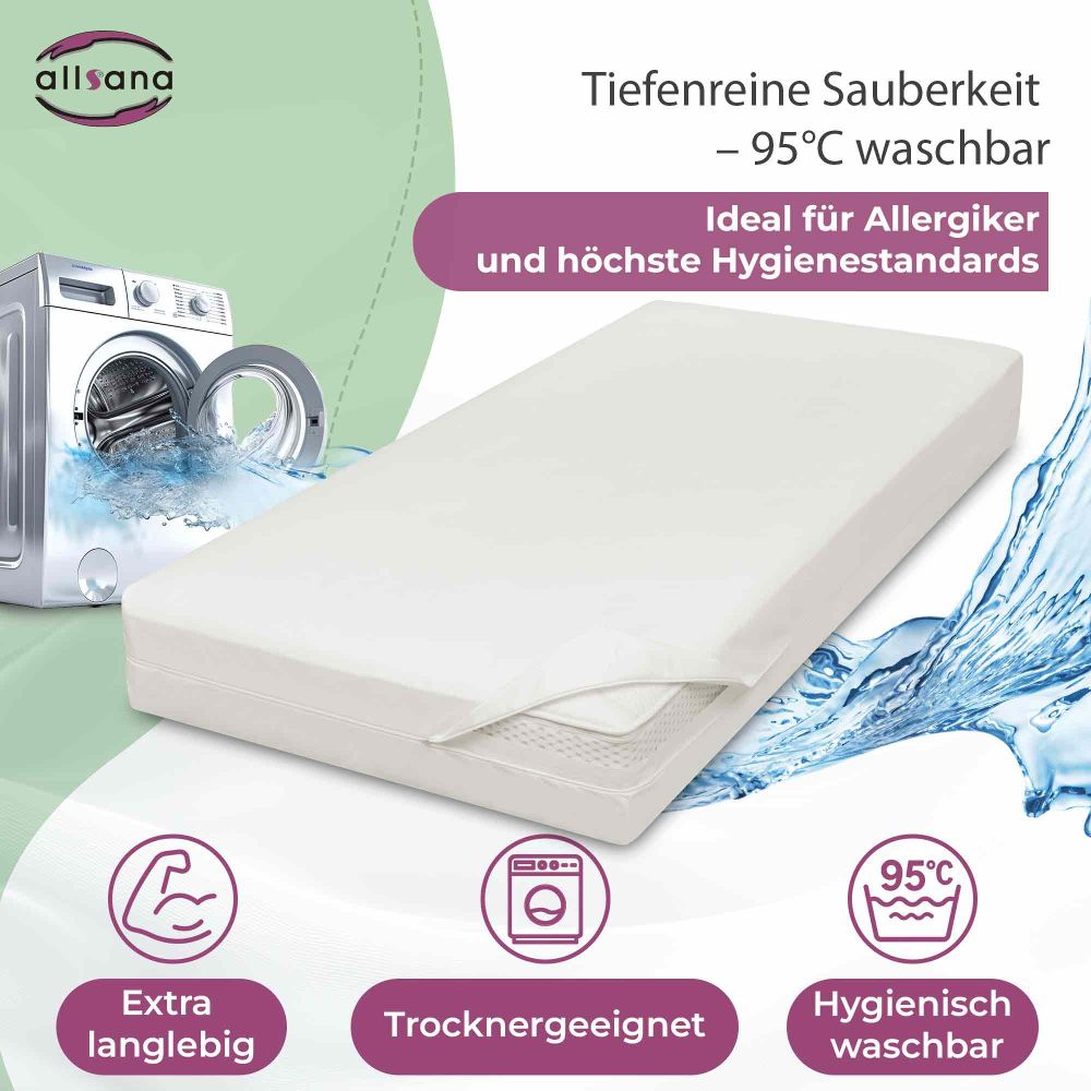 Waschanleitung: Allsana sensitive care Encasings können bei bis zu 95°C gewaschen werden und sind bei niedriger Temperatur trocknergeeignet. Wie alle Encasing müssen die allsana sensitive care Milbenschutzbezüge nur 2-3 mal im Jahr gewaschen werden. Über die Encasings wird die normale Bettwäsche gezogen und diese wird im gewohnten Rhythmus gewaschen.
