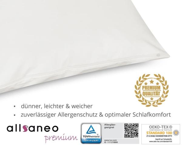 Die allsaneo premium Encasings bestehen aus einem neuartigen allergendichten Microfasergewebe, welches extrem leicht und dünn ist. Die Zwischenbezüge überzeugen durch geringes Gewicht (80 g/m²) und höchsten Schlafkomfort. Das sehr feine Material aus Super- Microfilamenten ist außerdem besonders dicht und bietet dadurch zuverlässigen Schutz vor Allergenen.