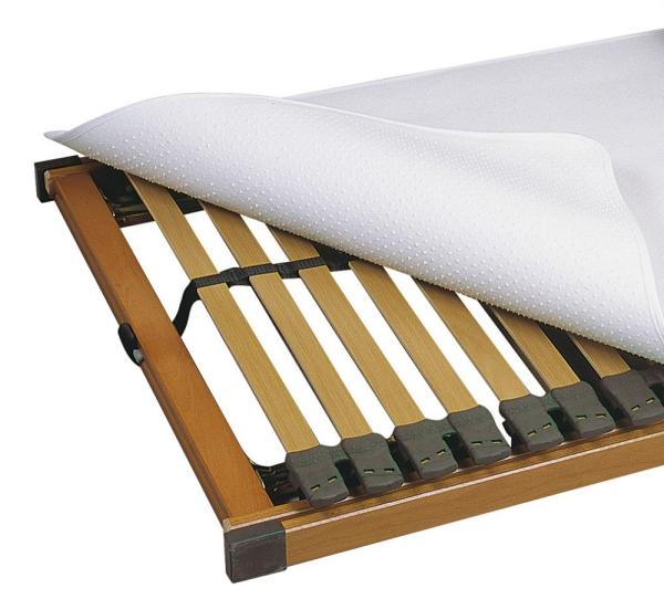 Matratzenschoner zum Schutz der Matratze von Unten. Der Noppen- Matratzenschoner wird auf den Lattenrost gelegt und schützt so die Matratze vor scharfen Kanten und Ecken. Besonders bei der Verwendung von Allergiker- Matratzenbezügen ( Encasings) sollte auch ein Matratzenschoner verwendet werden. So kann der empfindliche Stoff des Allergikerbezuges vor den sharfen Kanten des Lattenrostes bzw. des Bettgestelles geschützt werden. Dies erhöht die Lebensdauer des Encasings und verhindert Risse und Löcher.