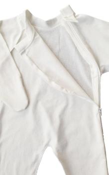 So wird der Neurodermitisschlafanzug mit einem seitlich verlaufenden Reißverschluss geschlossen. Dadurch stören keine drückenden Knöpfe oder Verschlüsse den Schlaf Ihres Kindes. Der Reißverschluss ist zusätzlich komplett mit weichem Stoff hinterlegt, sodass hier hei Hautkontakt besteht. Das Ende des Reißverschlusses ist ebenfalls mit einem Kinnschutz ausgestattet, sodass der Zipper weich gepolstert ist.